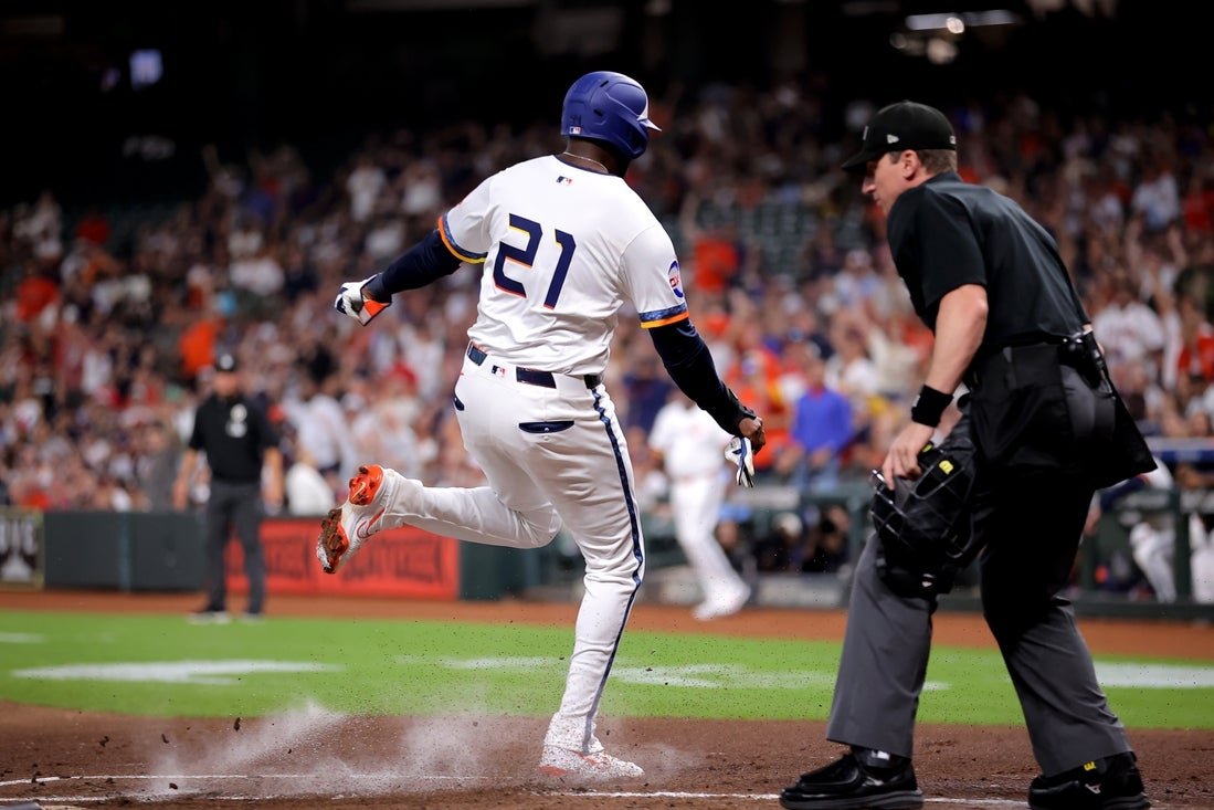 With Jeremy Pena on second and Alvarez on first with no outs in the bottom of the first, Carlos Correa topped a ball between the plate and the mound. Rangers pitcher Jack Leiter fielded the ball cleanly, but slipped as he fired the ball over first baseman Jake Burger’s head.