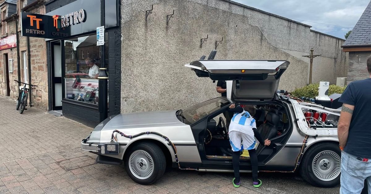 Locals in Alness were left stunned as the stainless-steel star fitted with gull-wing doors from the 1985 blockbuster drove through their high street yesterday.